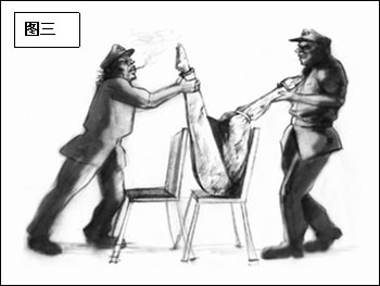 姓吴的恶警在我背后,将两个反绑的胳膊猛力向上推;小个子恶警在我前面将两个被脚铐固定的脚也猛力向上推,顿时我觉得更钻心的疼痛向我袭来,那种生不如死的感觉,几乎让我晕了过去,头脑中只剩一点意识:可能我的胳膊、腿都断了(图三)。
