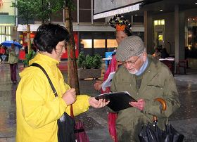 风光秀丽的卢加诺市位于瑞士意大利语区,是一个著名的旅游城市。五月十七日,法轮功学员冒雨在市中心设立了洪法摊位。虽然这天下雨不断,但是许多市民仍然热情接受了学员们散发的洪法材料,认真听取真相,人们踊跃签名表示他们对法轮大法的支持。下午五时,在参加此次活动的大法弟子对师父的衷心问候声中,结束了本次洪法活动。