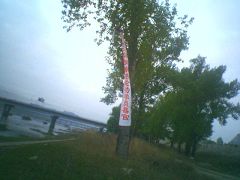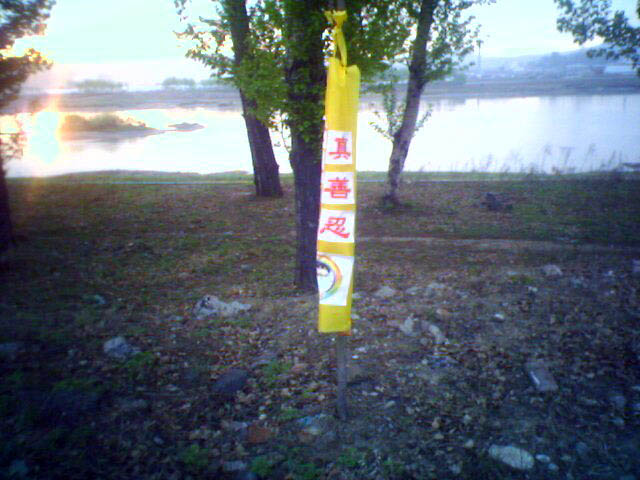 5月13日这天,晨炼的时候,在牡丹江看到了这样的景象,一条条横幅悬挂着树上,上面写着:“世界需要真善忍;世界法轮大法日”、“停止迫害,信仰无罪”、“立即释放被非法关押的法轮功学员”、“立即停止活体摘取法轮功学员器官”等字样,向人们传递着真相。不少老百姓说:共产党表面一样,背地里又一样,做着都是见不得人的事,难怪有人声明退出邪党,不愿做邪党的陪葬品,原来是这回事。