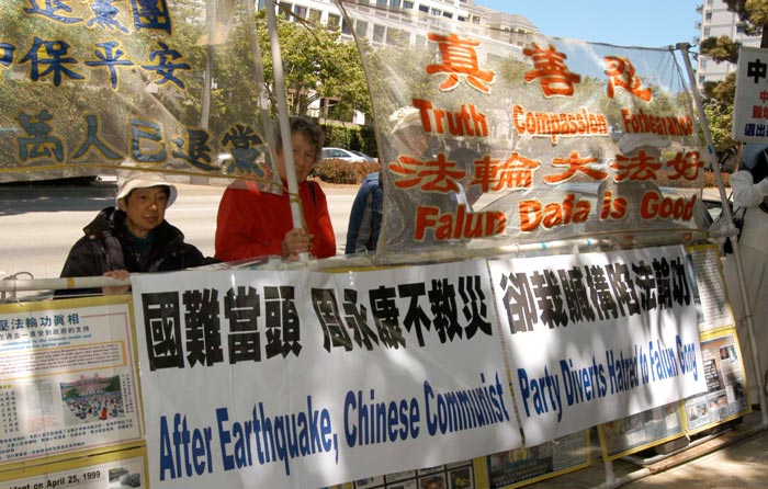 当天中午,在中领馆前的抗议民众展开“国难当头,周永康不救灾却栽赃陷害法轮功”,以及“抗议周永康收买暴徒在海外华人社区制造仇恨”的长幅标语;并向经过此地的民众派发真相传单,揭露中共政法委书记周永康,在国难当头之时,直接指挥中共的特务机构,在海外煽动仇恨,利用其背后控制的亲共华人侨团和留学生,在旧金山、纽约、 香港、日本等地攻击参加声援中国民众退党集会的华人。周永康是中共前公安部长,一直是帮助江泽民镇压法轮功的元凶。
