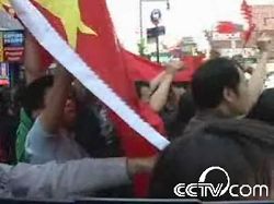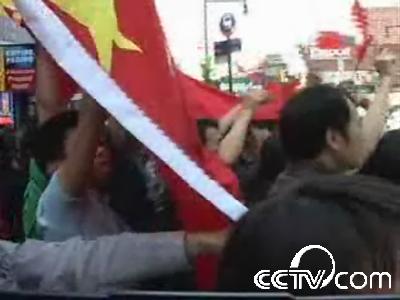 图为CCTV网站公布的十七日在法拉盛退党集会上扰乱的人群。中共媒体称是“自发”的“买菜群众”。实际情况是当日聚集近千华人,不少是从附近波士顿、费城等地赶来的,吵闹一开始,中共媒体立即摄像,背后的组织者迅速给闹事的人发中共旗,制造热爱中国的场面,这个画面在中国大陆媒体广泛播放。
