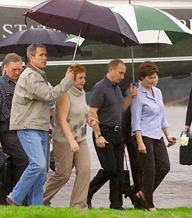 美国总统布什可没这么气派!刚下飞机,什么破伞,怎么也没人管?