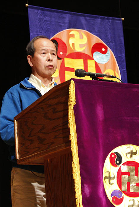 神韵艺术团的天音乐团指挥陈汝棠在法会上交流其修炼心得体会。