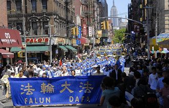 二零零八年五月二十五日,参加纽约法会的法轮功学员在曼哈顿唐人街举行了盛大的游行。