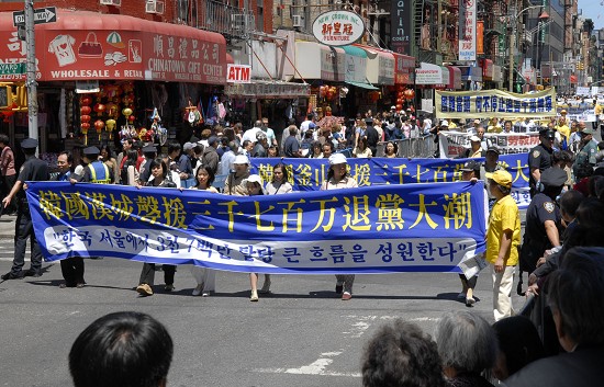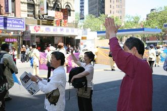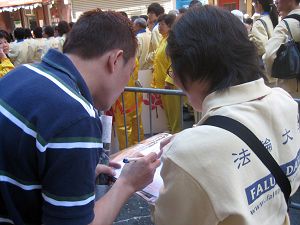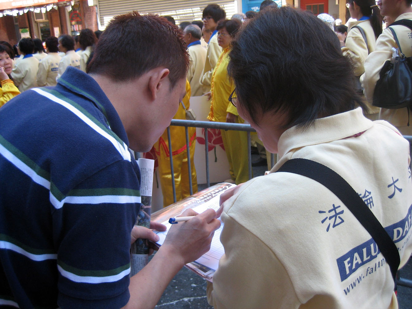 在游行途中,很多华人民众在接触了游行传递的真相讯息后,马上决定退出中共的邪恶组织。几年前从中国大陆来美国,在餐馆工作的叶先生,站在游行队伍旁,一边翻阅大纪元特刊,一边表示,很想了解法轮功,也想一起参加今天的游行。他说中共镇压法轮功是不对的,看着法轮功学员所展示的一张张揭露迫害的照片,他不但签了名呼吁制止中共迫害法轮功,同时还声明退出少先队和共青团。