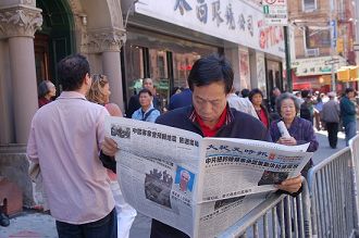 ![]() 市民认真的在路边阅读《大纪元时报》专刊,其中报导中共一手导演法拉盛事件,围攻并栽赃法轮功学员的退党、讲真相活动。 |