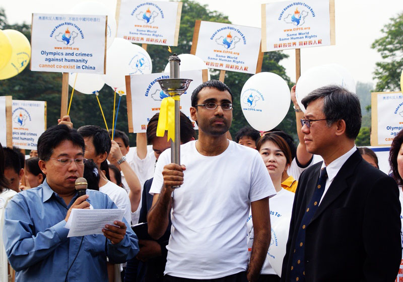 法轮功受迫害真相联合调查团在马来西亚的代表苏仁德(N. Surendran)接过圣火