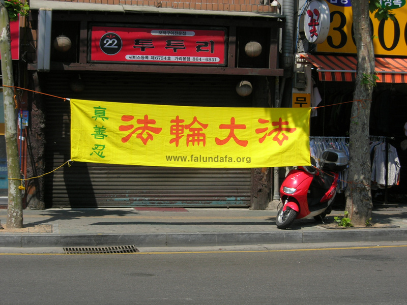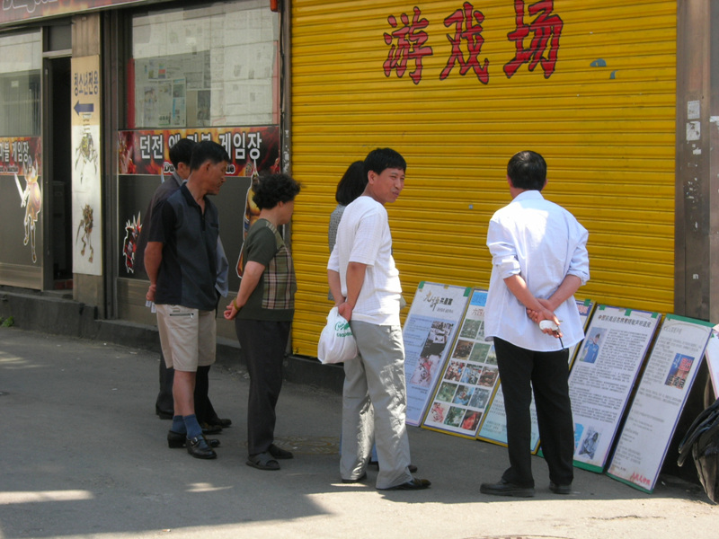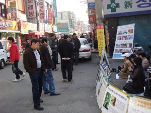 在加里峰有个大的商业街,这个商业街的入口可以说是韩国中国人流量最大的地方之一,因此我们也就决定将加里峰退党中心设在这里。这入口处真的是寸土寸金。开始的时候我们在一个地方摆好资料展板,但很快就有位卖鞋的大叔占了这个地方。我们也不能和别人争,我们就将展板放到一家经营二手电器的商家旁边,很快老板就对我们提出抗议。没办法我们又将资料和展板摆放到一家药店附近,开始的时候药店老板没说什么,后来老板也是觉的我们影响了他的生意就出来让我们换地方。我们左找右看,真的是找不到合适的地方,没办法我们就将资料和展板放到了一个警察局的临时办事处(平时这里没人)附近。虽然有些警察过来巡逻时会要求我们不要在那里做,但我们也真的是没地方搬了,很多警察慢慢的了解了我们,了解了真相后也就不管了,而且还很支持我们。有一天早晨我来到退党中心,想要把退党中心的大牌子挂到此警察局办事处的窗子上,正在挂的时候我发现一名警察坐在里面,我当时心里一惊:“他不会说我吧?”那个警察从里面出来说:“天这么冷还坚持啊?辛苦了。”听了这话我眼泪差点掉出来,我在想:“多好的警察,多好的人啊!我们中国的警察为什么不能这样对我们的老百姓啊?”现在我们的退党中心已经在加里峰站稳了脚跟。