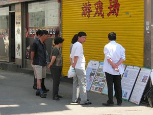 有一天早上我们刚把一切整理好,这时突然有两个人过来大吵大嚷,说我们卖国、说我们没有良心、说我们有本事到国内去说、说我们丢尽了中国人的脸。他们这么一嚷嚷,一下子围过来好几十个中国人,黑压压一片,你一句他一句都在指责我们,那两个大吵的中国人好象被壮了胆儿似的,喊得更厉害了,开始用脚踢展板,还有一个中国人甚至拿出刀要破坏展板。看到这里,一位同修坚定的喊道:“大家冷静一下,我们都是中国人,有什么话心平气和的讲,如果我们有什么错误请大家理性的指出来,无论你们说法轮功好还是不好,我希望是经过你们理性的思考与判断后得出的结论,如果你们说的对我们会感谢你们的。但有一点是非常真实的,法轮功学员在国内被迫害的非常严重,几乎天天都在死人,他们都是我们的同胞啊!今天我们的决心已定,就是要彻底解体中共,解体这个祸害中国民众这么多年的恶党,而且我们坚信其被解体的日子很快就会到来了,正所谓:‘天灭中共’,请大家好好想想这么些年共产党对我们老百姓到底都做了些什么?”话音一落,众人好象平静了很多,还有一个年纪稍大的中国人依旧非常激动,我走过去平静的说:“大爷,别生气,有话慢慢说,您这么大年纪一定要注意身体啊!”听了这话那位大爷也平静了下来。慢慢的一些人散去了;一些人依然不满的小声发着牢骚;有些人蹲下来看展板;还有些人过来索要真相资料。这小小的风波就这样过去了,在整个过程中没有一个同修动气,当然更没有一个同修退缩。