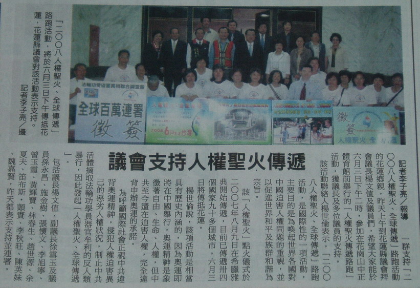 花莲县议长杨文值签名支持「全球百万联署」活动,希望以理性、平和的方式在奥运前制止中共迫害法轮功。二零零八年五月二日,花莲县议会召开第十六届第五次定期大会中提案通过,欢迎由「法轮功受迫害真相联合调查团」发起的「人权圣火」活动于六月三日来到花莲。