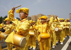 法轮功小弟子的腰鼓队也一同庆祝三千六百万中国勇士退出中共邪党相关组织