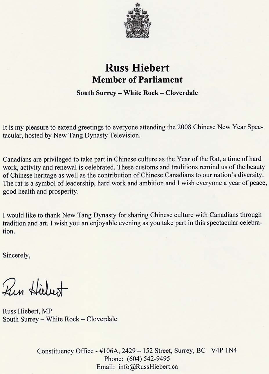 ![]() South Surrey区的国会议员Russ Hiebert的贺信 |