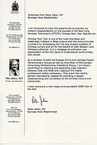 ![]() 本那比-新西敏(Burnaby-New Westminster)的国会议员Peter Julian的贺信 |