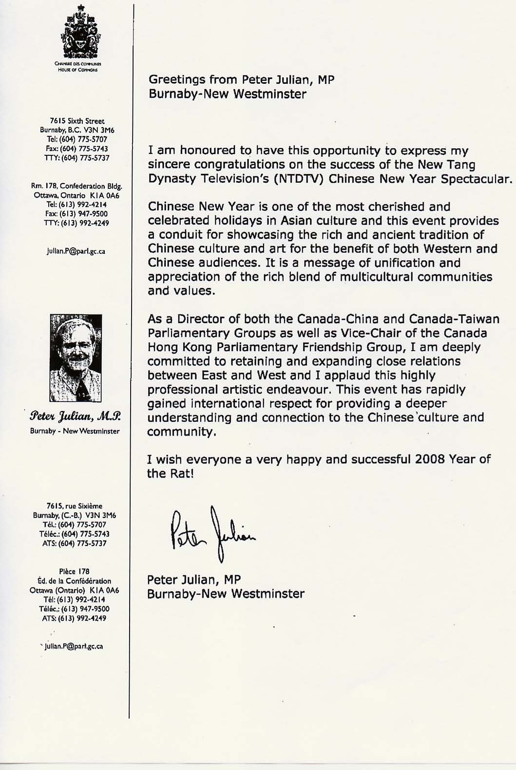 本那比-新西敏(Burnaby-New Westminster)的国会议员Peter Julian的贺信表示:“我感到很荣幸能借此机会向新唐人电视台举办的神韵新年晚会表示衷心的祝贺。我并祝愿大家新年愉快,鼠年万事如意。”