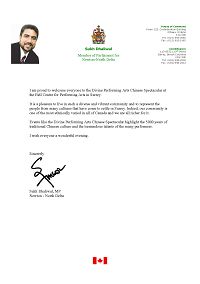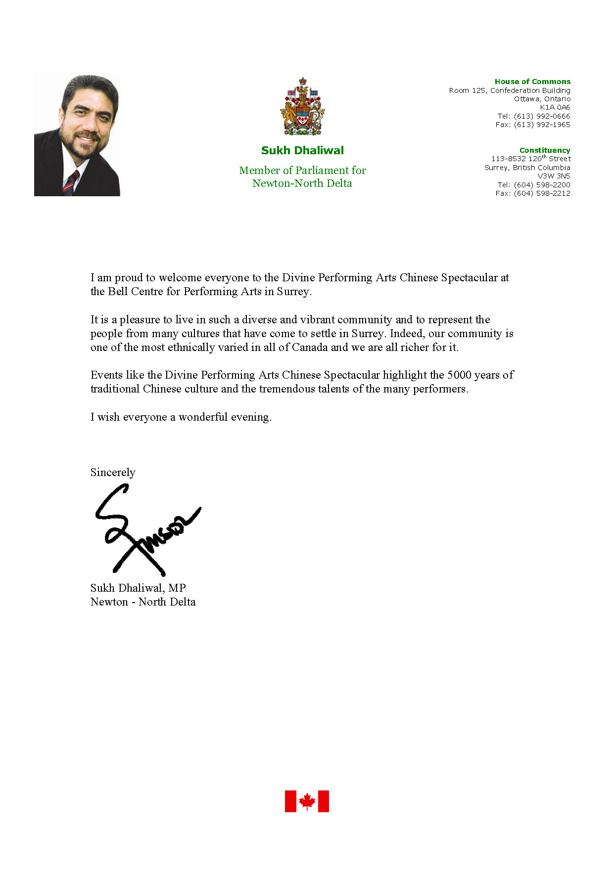 Newton•North Delta区的国会议员Sukh Dhaliwal来信祝贺表示:“我很高兴的欢迎大家来观看神韵艺术团在素里贝尔中心的中国文化艺术演出。”