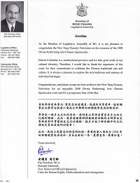 贺信中表示,“卑诗是一个多元文化的省份,我们更以卑诗省丰富及多元的文化感到骄傲。在此,我要感谢举办神韵晚会活动的主办单位及参与者对中华艺术及文化的推动,能多方面了解各种不同文化传统及习俗是我们的荣幸!在此,我致上我最崇高的敬意与祝福,希望新唐人电视台二零零八年的神韵晚会表演成功,并且在新的一年──农历鼠年,万事如意。”