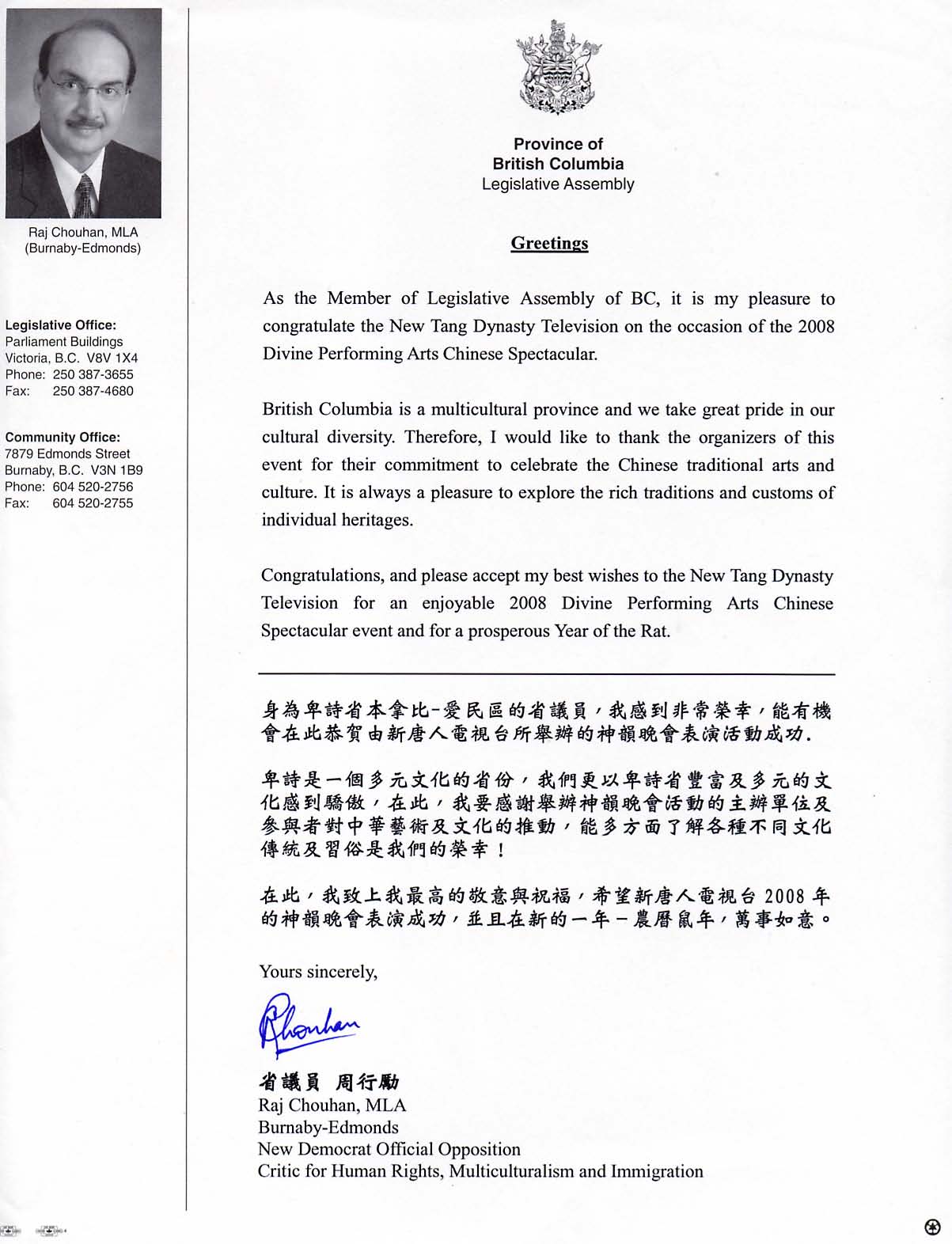 卑诗省本拿比──爱民区的省议员周行励(Raj Chouhan)致信,祝贺由新唐人电视台所举办的神韵晚会表演活动成功。