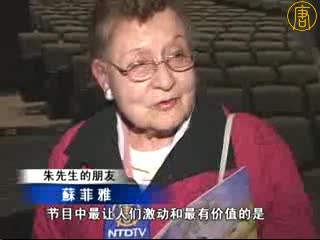 朱先生的朋友苏菲雅女士观看演出后,非常感谢她的朋友朱先生邀请她看神韵晚会,她赞赏神韵体现了人类真正的价值。苏菲雅说:“节目中最让人们激动和最有价值的是,尤其是歌唱家谈到的道德,神赐天意,这些是我们的世界真正而绝对珍贵的东西。”
