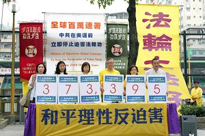 香港法轮功学员在二零零八年五月一日举行反对中共迫害的集会及游行,抗议中共借口奥运加剧对法轮功的迫害。