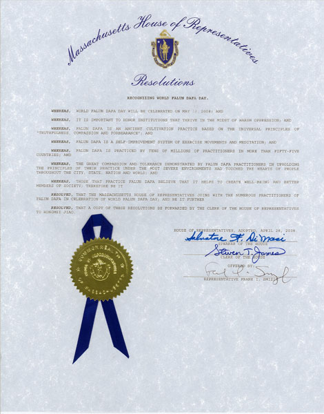 决定,麻萨诸塞州众议院与法轮大法修炼者同庆世界法轮大法日;进一步
