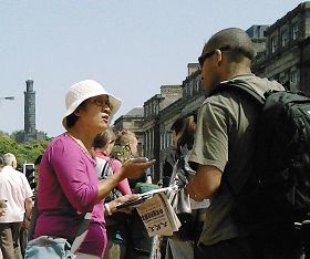 二零零八年六月七日周末,苏格兰法轮功学员们在爱丁堡的市中心展开了洪法、讲真相活动。