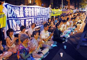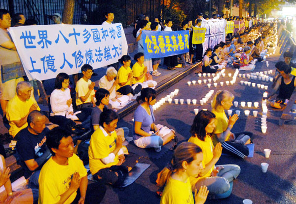 沿Kissena街从中美超市对面一直延续到Sanford路口,大约五百多名法轮功学员炼功。八点左右,夜幕降临,一盏盏橘黄色的烛光点燃,熠熠生辉。几百名法轮功学员静坐在烛光下,平和宁静中,展现着法轮功学员的坚韧。