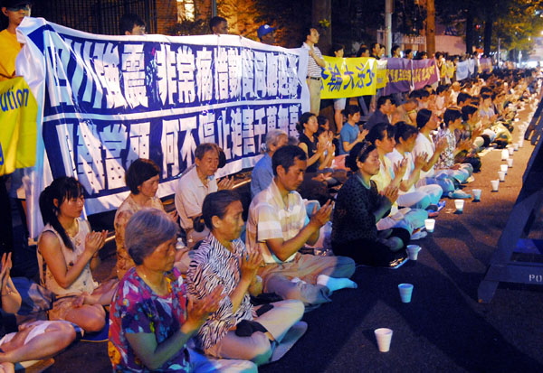 烛光悼念于七点开始,法轮功学员在法拉盛Kissena大道拉出了一幅幅巨型横幅,“法轮大法好”、“世界需要真善忍”、“四川强震 非常痛惜数万同胞遇难,国难当头 何不停止迫害千万无辜”等。