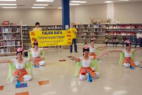 法轮功学员今年表演的节目除了功法演示外,女学员们还表演了莲花舞,一名西人学员独唱了由法轮功学员创作的歌曲。