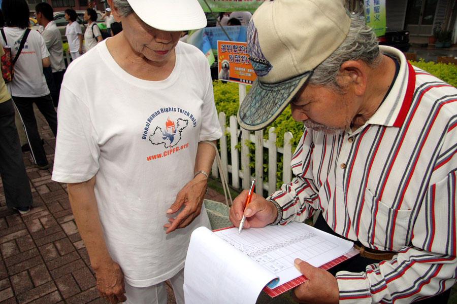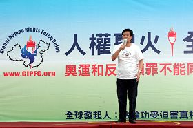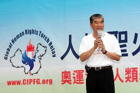 前行政院首席顾问邱垂贞先生,为“法轮功受迫害真相联合调查团”(英文简称CIPFG)亚洲分团成员,担任过四届立委,也是桃园区人权大使。他上台致词时表示,他曾经为了人权失去自由,所以更觉得人权可贵。对岸的中国却在共产党的统治下让人民失去自由,不但迫害人权,还干出活摘器官迫害法轮功的行为,是全世界最没有人权的国家。全世界对其行径感到不齿,所以奥运火炬所到之处,抗议声不断。他呼吁全世界的人民都能共同关注中国迫害法轮功人权的事实。