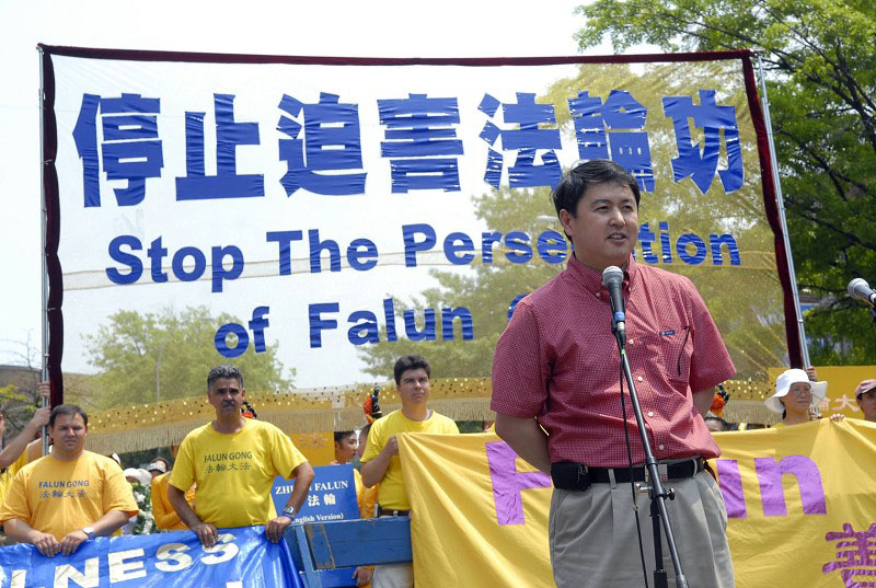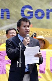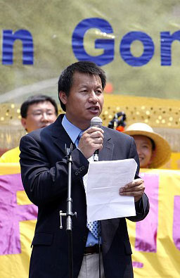 ![]() 法轮功学员发言人张而平在集会上发言 |