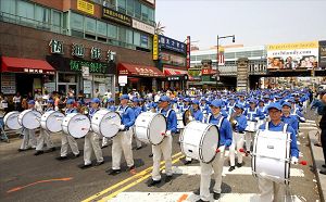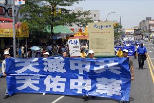 【明慧网二零零八年六月十五日】(明慧记者舒静纽约法拉盛报导)二零零八年六月十四日,法轮大法美东佛学会和全球退党服务中心在纽约法拉盛举行了盛大的“法轮功反大游行”和“声援中国民众退党潮大集会”。约二千名法轮功学员参加了声势浩大的游行,展示法轮大法洪传世界八十几个国家与地区的美好,展示法轮功学员九年来坚持和平反迫害的历程,展示《九评共产党》一书引发的退党大潮。