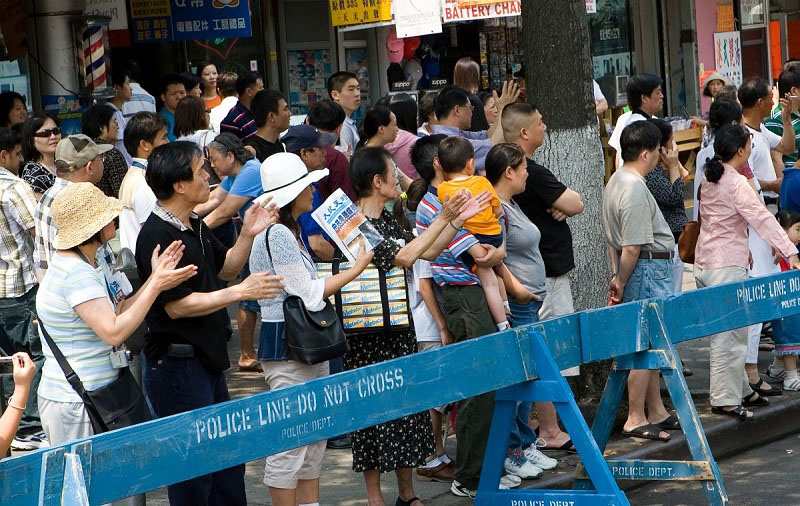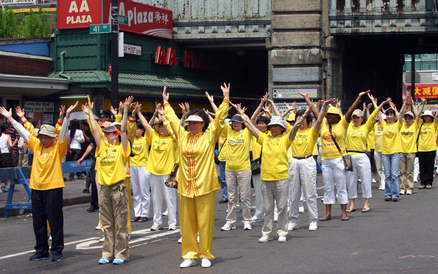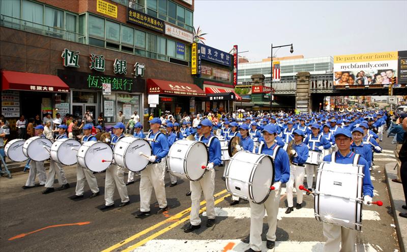 虽然天气炎热,沿途仍有很多观看者,游行于中午十二时开始,从缅街与四十一路开始〔Main Street & 41th Road〕,途经法拉盛最繁华的缅街,从富兰克林街转到凯辛那大道。游行规模盛大,主题是“法轮大法好”,有六大方阵组成,包括“天国乐团”、法轮大法介绍、反迫害、法轮大法洪传、九评退党等。