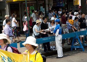 一位刚从中国大陆出来的男士看到法轮功的游行及集会,他说:“我看到了法轮功学员的善,心里很感动。”