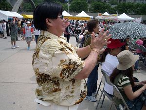 当艺术团成员为观众展示法轮功功法的时候,引来了很多人的注目。后排有些观众站起来,开始跟着学。
