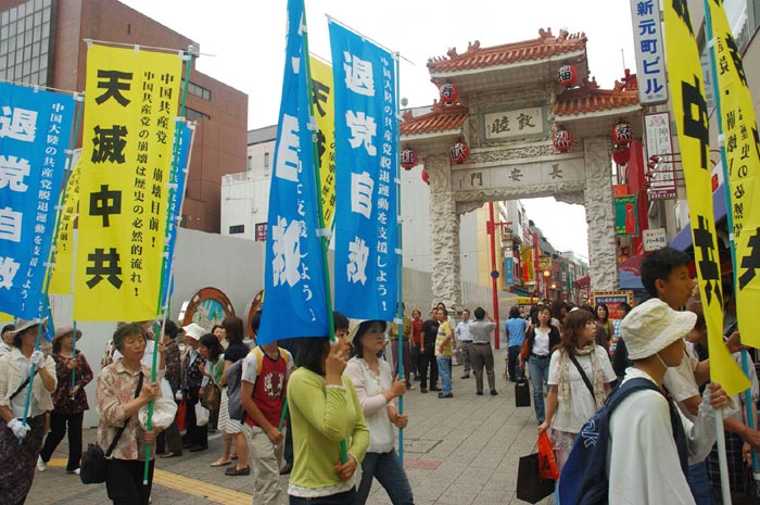 神户是个华侨聚居的港口城市。退党游行经由商店街和中华街等繁华地段。很多人驻足观看,当退党服务中心的义工递给他们传单时,很多人似乎都很期待的接受,和以往印象中不接受传单、目不斜视的日本人形成鲜明的对比。