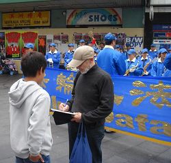 集会的同时,退党服务中心义工们手举着横幅和展板在市区的乔治街上举行真相长城,揭露中共暴政给中国人民带来的灾难,把“爱国不等于爱党”、“没有共产党,才有新中国”、“天灭中共,天佑中华”等信息传递给人们。同时在唐人街退党服务中心的摊位上用大屏幕投影反复播放中共暴徒围攻法拉盛退党服务中心,殴打法轮功学员、退党义工等实况录相。法拉盛暴力事件引起澳洲社会的关注,在悉尼的退党集会吸引了许多路人进一步了解真相,很多人都乐意拿法轮功学员所递的法拉盛事件真相特刊,正义民众纷纷签字声援。