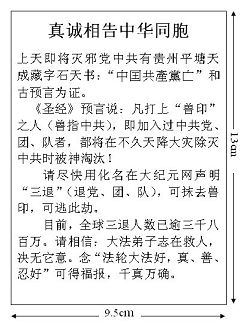利:1、劝“三退”是当前大法弟子救度众生的重要使命之一。在以往印刷的真相资料广泛传播的情况下,辅以手写劝“三退”短信,更易引起人们的好奇与关注,从而收到更好的效果。2、短信虽短,但能一语中地,瞬间生效。有缘人见之,一览即知其要,动其善念为后来“三退”创造条件。3、短信耗费甚少,成本低廉,而且制作简便快捷高效。一次可复写10份,只需10分钟左右。为缺少资料的弟子提供了讲真相的条件。4、“自封袋”袋装短信柔中有刚、剔透玲珑,便于携带不易损坏。可顺手用图钉按在树上,单元楼的门框上,简便、快捷,而且防潮防雨,可保存较长时间。5、与其它真相资料同袋发放时,可起到锦上添花,甚至是画龙点睛的意外效果。