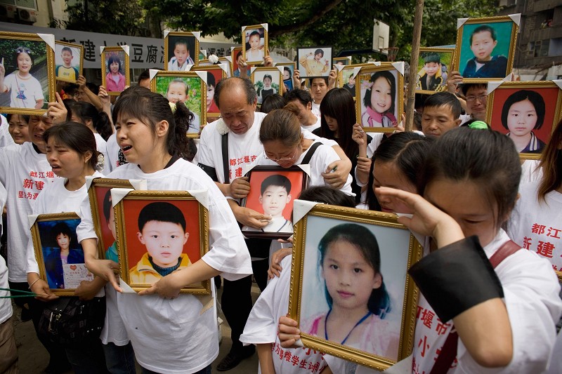 据BBC报导,数百名学生父母站在新建小学的操场上。他们回到自己孩子的学校要讨还公道。这些父母们手里都捧着自己孩子的遗像,每一名死难学生的父母都身穿“为遇难学生讨回公道的”T恤衫。一名母亲对着自己死去的孩子说,“孩子你死得冤啊!”