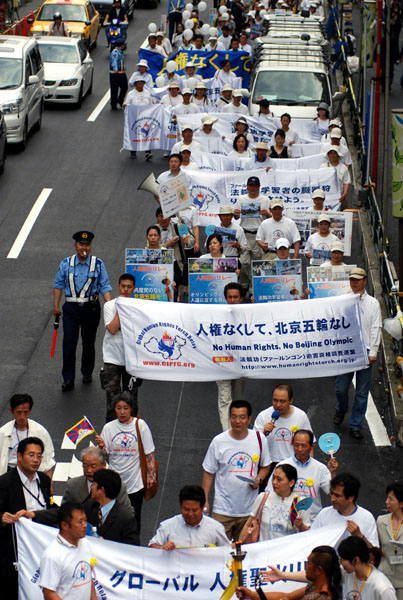 游行队伍经过东京涉谷地区繁华的街道,引来民众的热烈关注。游行队伍回到主会场后,在人权圣火东京到长野的移交仪式前又进行了一场集会,多名在日华人代表进行了发言。