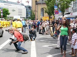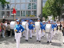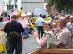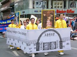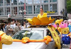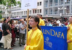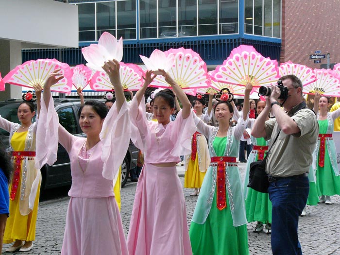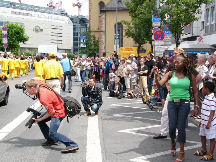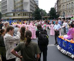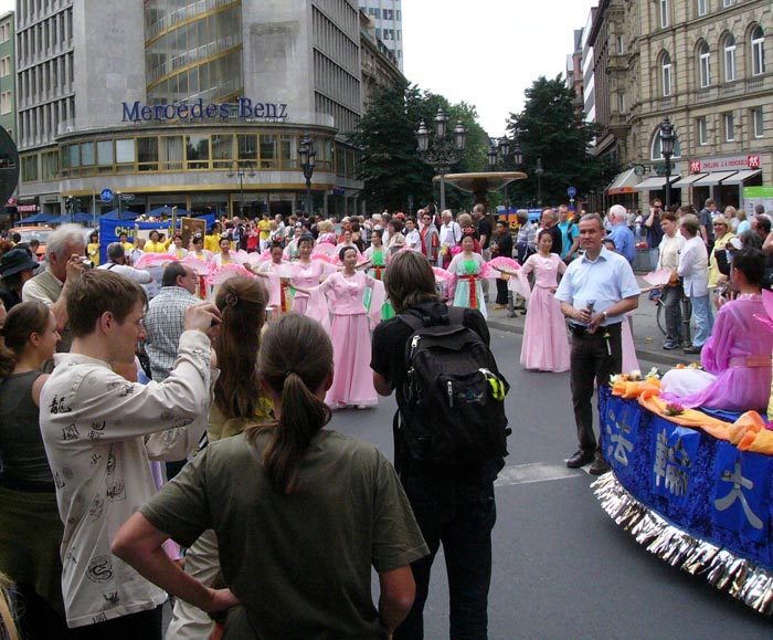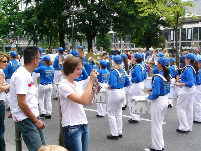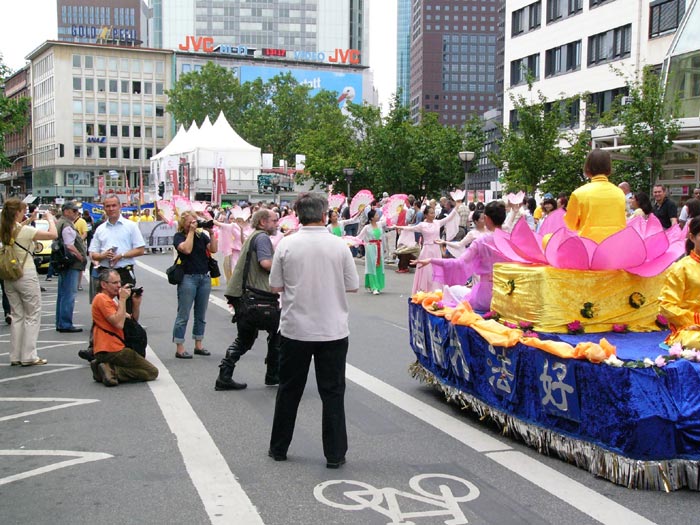 法轮大法协会的游行方阵内容丰富,包括天国乐团、法轮功功法演示、中国传统舞蹈等,还有一个方阵揭露了中共对法轮大法长达九年的残酷迫害。沿途的观众们报以热烈的掌声,无论记者还是普通市民都纷纷举起相机,希望留下这精彩的画面。