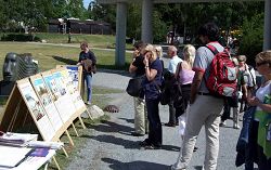 有五位华人女士没敢拿报纸,看着同伴参观完出来都坐在石凳上每人拿一份《大纪元时报》在认真的看时,她们也不由自主的走到展板前,认真的观看并低声的交谈着。学员走上去给她们讲大法真相,讲退党大潮,她们默默不语,静静的听着、在思考着。还有一位男青年从桌子上拿走了一本精装本《九评共产党》,如获至宝的,装在兜里走了。