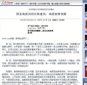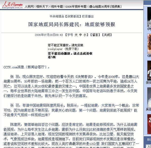 ![]() 二零零六年七月二十八日,中国国家地震局局长陈建民在中央电视台《决策者说》中说:“地震是可以预报的”。(网络截图) |