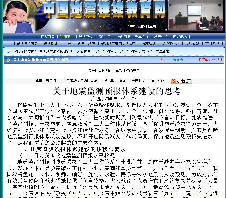 ![]() 中国地震继续教育网上刊登广西地震局劳王枢写的一篇题为《关于地震监测预报体系建设的思考》文章(网络截图) |