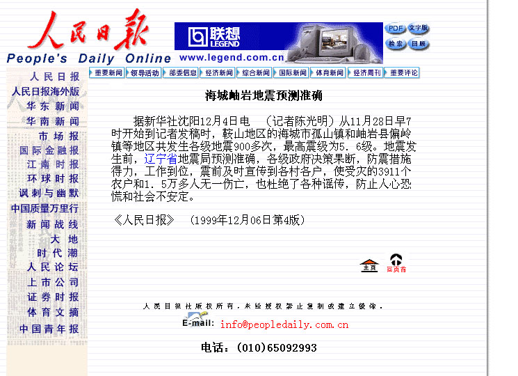 ![]() 《人民日报》(1999年12月06日第4版)发表一篇题为〈海城岫岩地震预测准确〉报道,称“辽宁省地震局预测准确”。 |