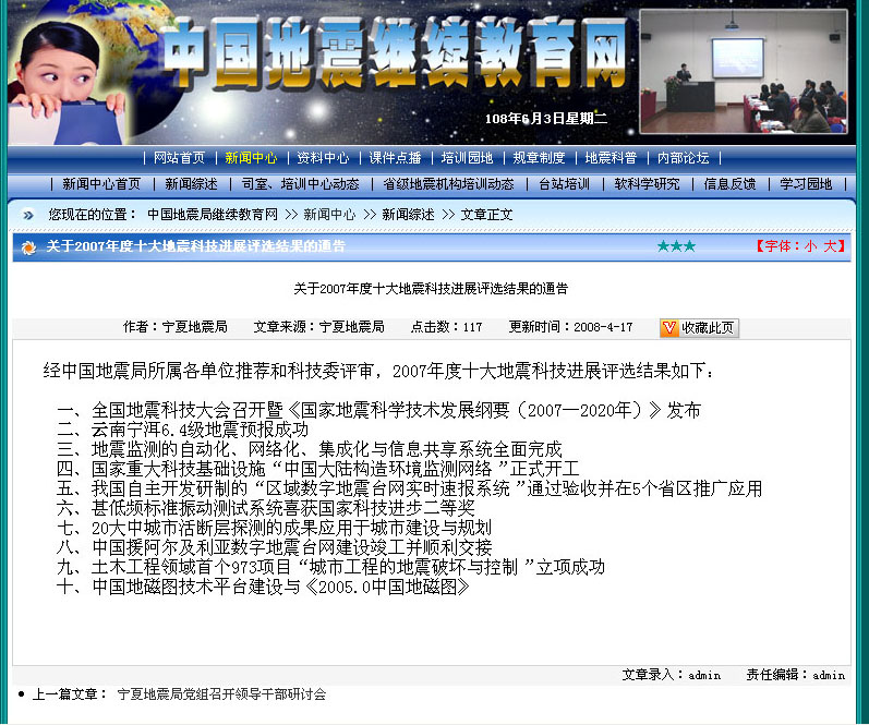 ![]() 中国地震继续教育网发表一篇由宁夏地震局供稿的《关于2007年度十大地震科技进展评选结果的通知》(网络截图) |