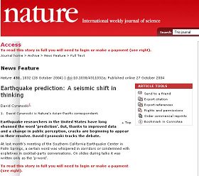 二零零四年十月二十八日,英国《自然》杂志刊登一篇题为《思路的剧变》(Earthquake prediction: A seismic shift in thinking)的报道,指出地震预测预报研究开始出现“升温”[3],这是一个很大的转折。