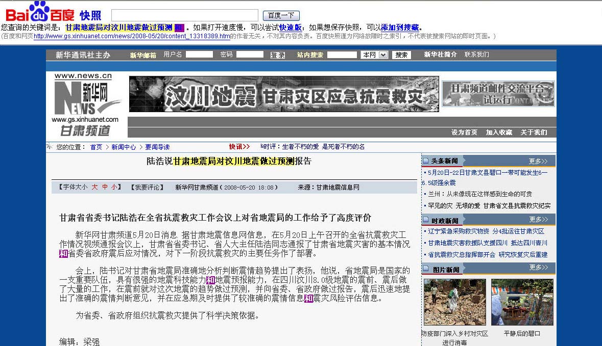 新华社五月二十日发表一篇题为《甘肃省省委书记陆浩在全省抗震救灾工作会议上对省地震局的工作给予了高度评价》的报道。在报道中,甘肃省省委书记陆浩说“甘肃省地震局对汶川地震做过预测报告”,甘肃省地震局“具有很强的地震科技能力和地震预报能力,在四川汶川8.0级地震的震前、震后做了大量的工作,在震前就对这次地震的趋势做过预测,在震前就对这次地震的趋势做过预测,并向省委、省政府做过报告”(见下图)。