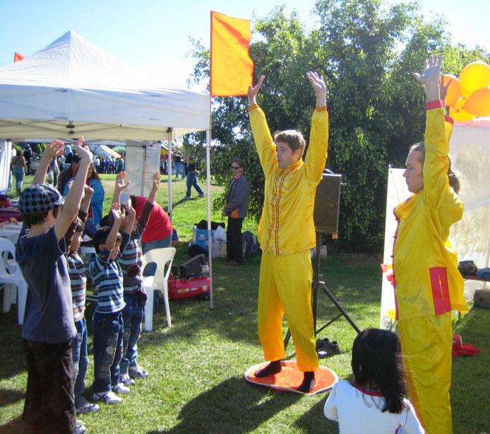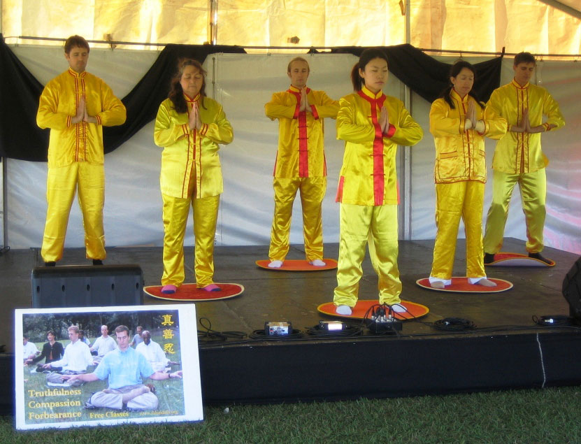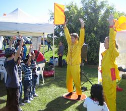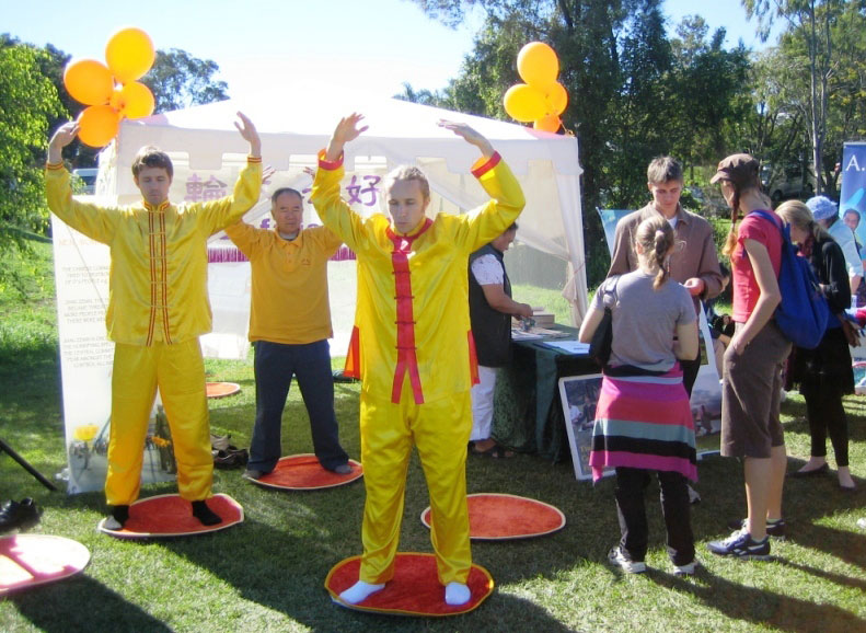 布里斯本一年一度的世界难民日社区庆典活动,吸引着来自不同民族背景的人们。继去年广受当地民众的欢迎喜爱,昆士兰法轮功学员再度来到世界难民日活动上传播大法福音。约上午十点,主办单位邀请学员们上台展示及介绍法轮功的五套功法,此外,学员们也特地为观众献上中华传统舞蹈表演。当炼功音乐响起,身着金黄色炼功服、展示着功法的学员们吸引了人们的目光。观众们纷纷拿出相机捕捉这祥和殊胜的镜头,一些人跟着在台下学炼功法。