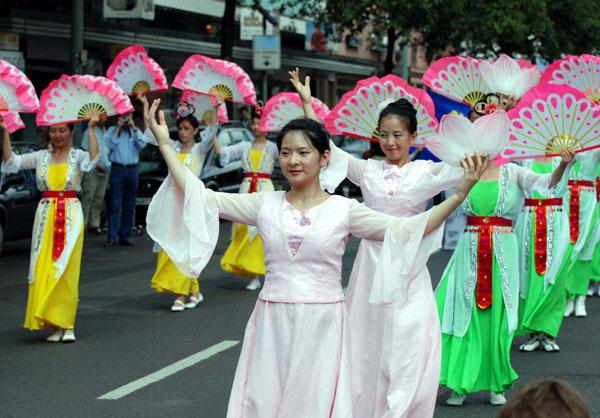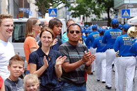 ![]() 观众们对法轮功队伍报以热情的掌声 |