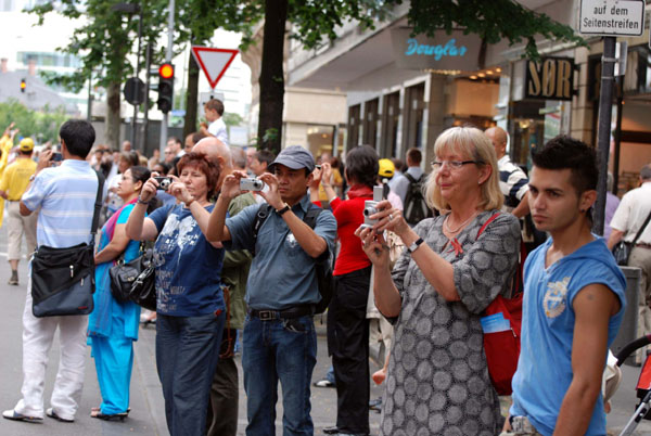 在天国乐团经过时,有的观众合着音乐鼓掌舞蹈,有的静静的倾听着,有的则随着音乐阅读刚拿到的关于天国乐团和法轮功的真相资料。有的则拿出相机,留下天国乐团的雄姿,炼功队的祥和,和仙女队的倩影。当队伍最后的方阵——活动的劳教营出现时,有的人开始出现不解,为什么会有如此悲惨的场面出现,但是通过学员的讲解,或是阅读了真相材料后,他们向法轮功学员表示自己的支持。